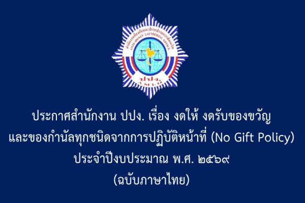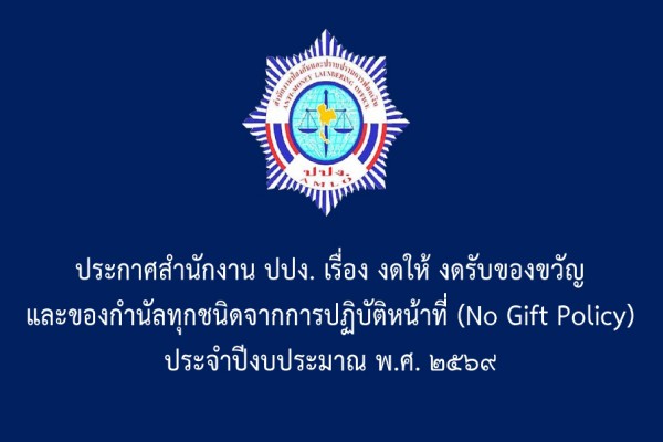 ประกาศสำนักงาน ปปง. เรื่อง งดให้ งดรับของขวัญและของกำนัลทุกชนิดจากการปฏิบัติหน้าที่ (No Gift Policy) ประจำปีงบประมาณ พ.ศ. ๒๕๖๙