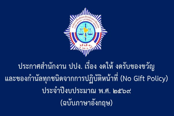 ประกาศสำนักงาน ปปง. เรื่อง งดให้ งดรับของขวัญและของกำนัลทุกชนิดจากการปฏิบัติหน้าที่ (No Gift Policy) ประจำปีงบประมาณ พ.ศ. ๒๕๖๙ (ฉบับภาษาอังกฤษ)